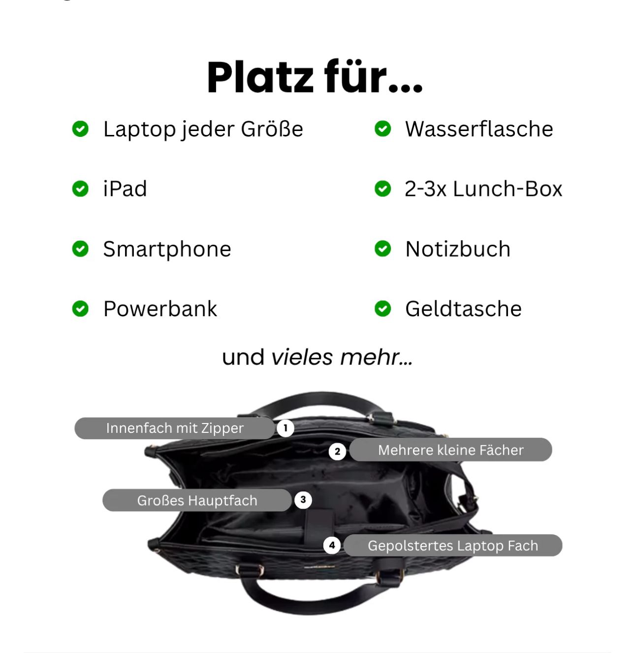 Ja, sie bietet Platz für Laptops bis 15 Zoll sowie Tablet & Zubehör.